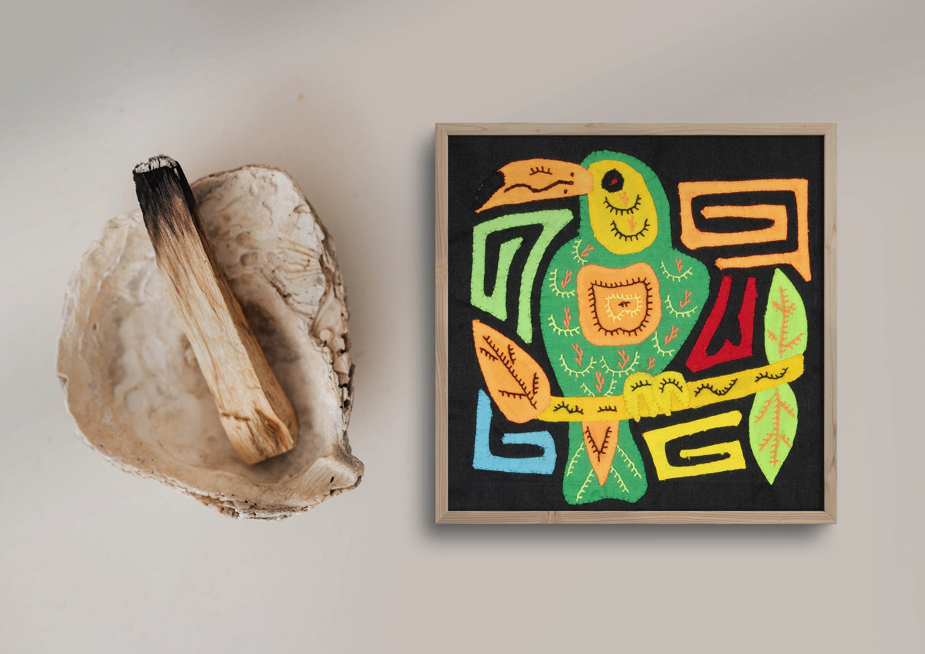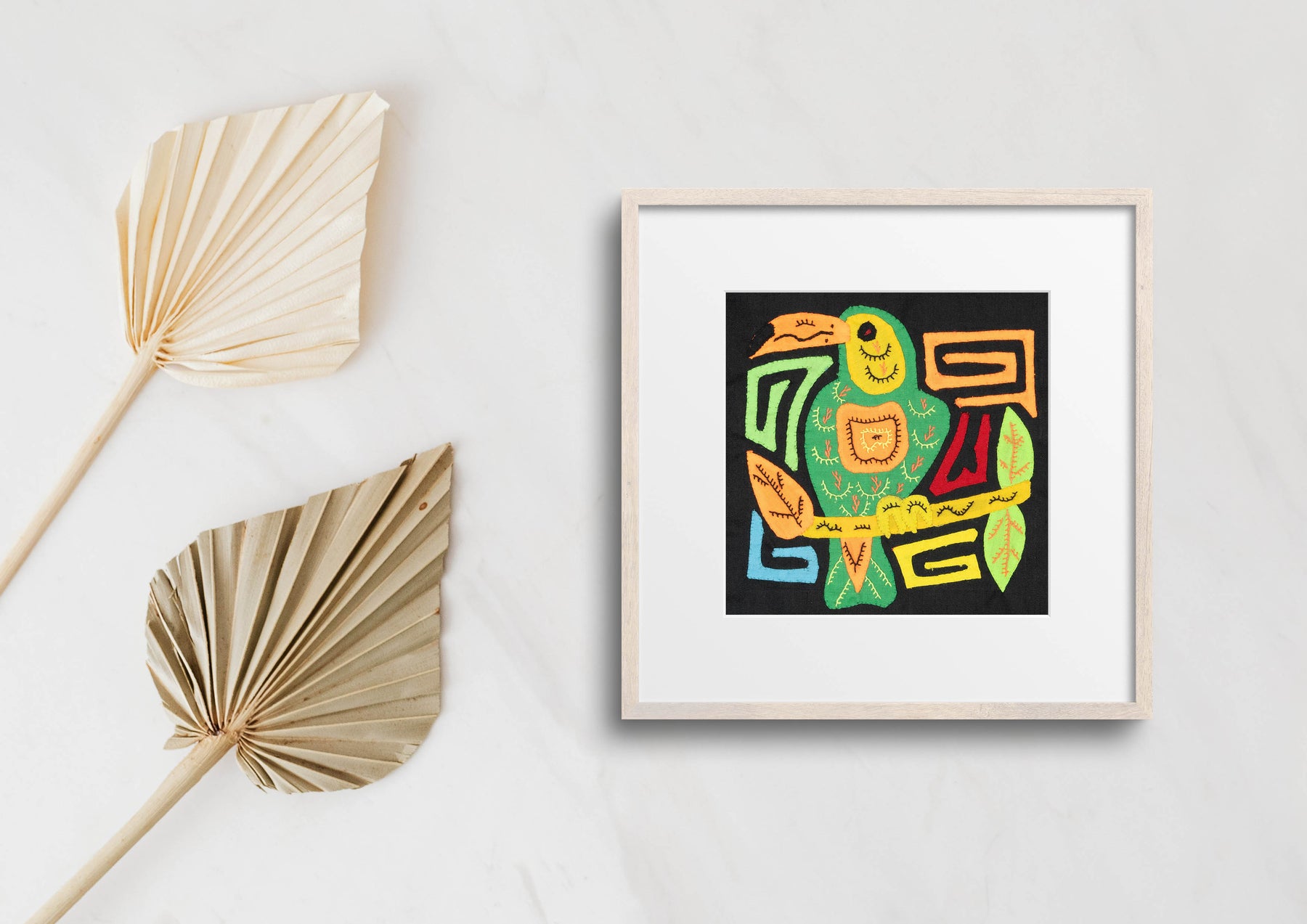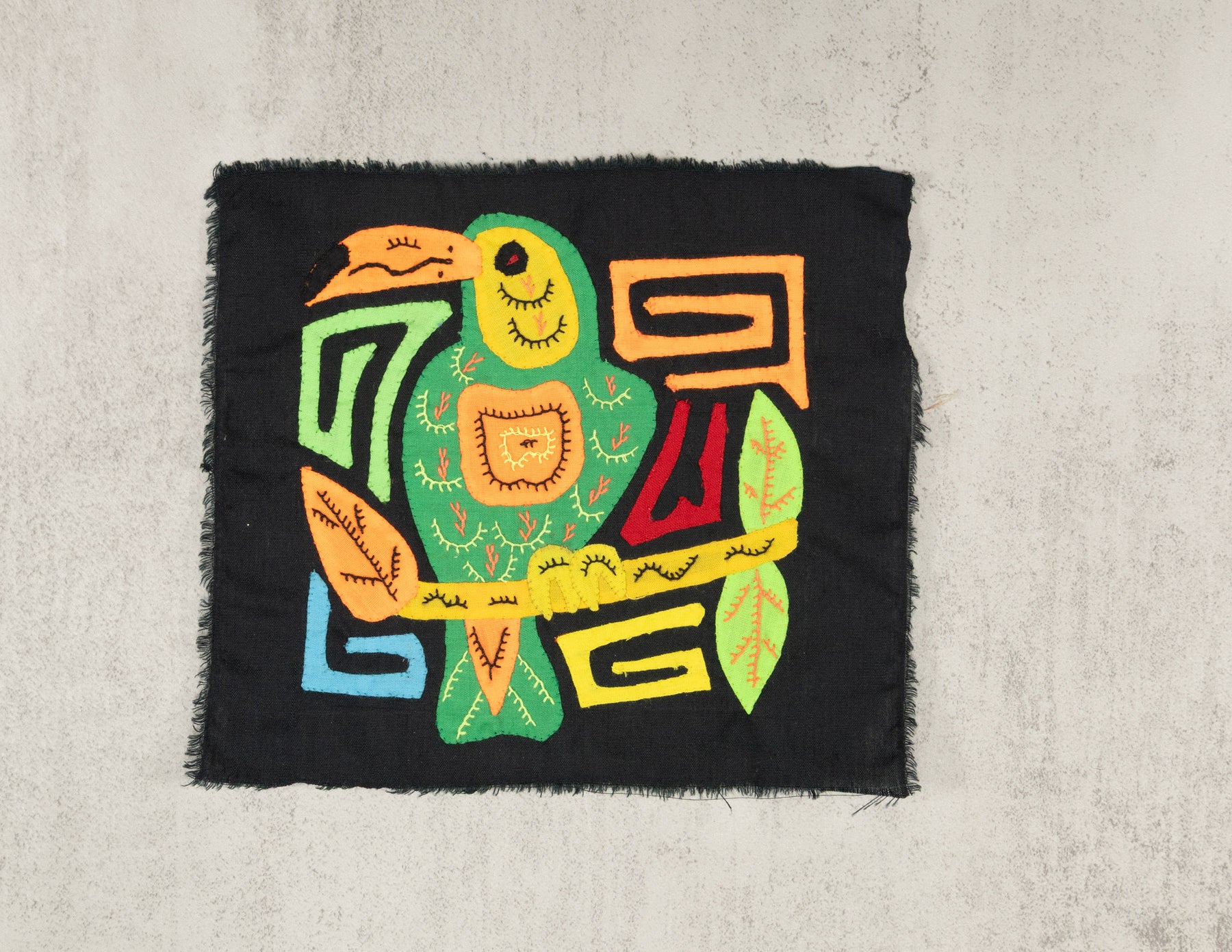 Hand sewn from layered cotton fabric, this colorful Multicolor Orange And Green Bird Molita celebrates the traditional textile art of the Guna people of Panama. Each small panel is created using reverse appliqué, where artisans carefully cut and stitch several layers of cloth to reveal intricate patterns, animals, and geometric motifs. Every molita is made by our artisan partners for TraderBrock, supporting long term relationships with Guna communities in the Guna Yala region.