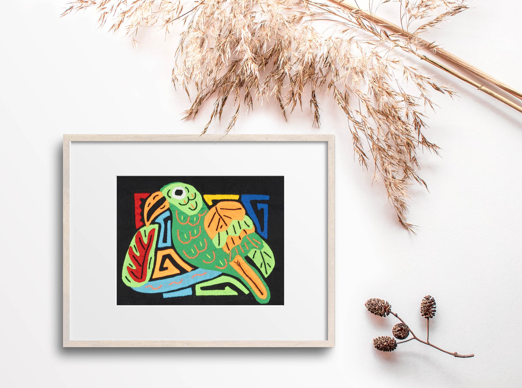 Hand sewn from layered cotton fabric, this colorful Multicolor Orange And Green Bird Molita celebrates the traditional textile art of the Guna people of Panama. Each small panel is created using reverse appliqué, where artisans carefully cut and stitch several layers of cloth to reveal intricate patterns, animals, and geometric motifs. Every molita is made by our artisan partners for TraderBrock, supporting long term relationships with Guna communities in the Guna Yala region.