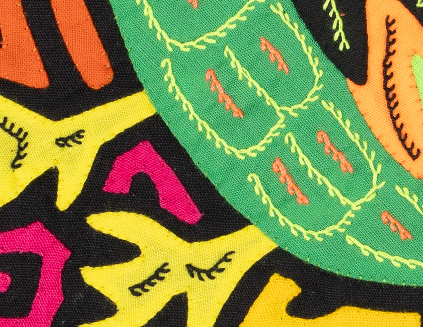 The process begins with layering vibrant cotton fabrics, which are carefully cut to reveal intricate patterns beneath. Guna artisans then use a combination of appliqué and reverse appliqué techniques, often enhancing each piece with fine hand embroidery. The result is a stunning, one-of-a-kind work of textile art rich in tradition, color, and cultural meaning.