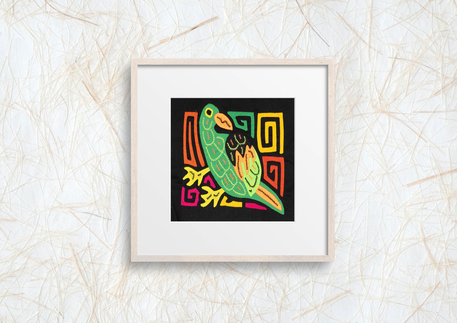 Hand sewn from layered cotton fabric, this colorful Multicolor Orange And Green Bird Molita celebrates the traditional textile art of the Guna people of Panama. Each small panel is created using reverse appliqué, where artisans carefully cut and stitch several layers of cloth to reveal intricate patterns, animals, and geometric motifs. Every molita is made by our artisan partners for TraderBrock, supporting long term relationships with Guna communities in the Guna Yala region.