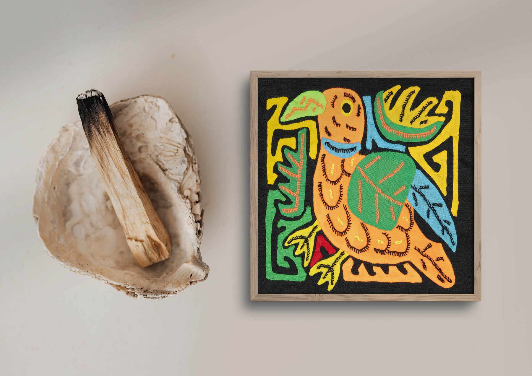 Hand sewn from layered cotton fabric, this colorful Multicolor Orange Bird Molita celebrates the traditional textile art of the Guna people of Panama. Each small panel is created using reverse appliqué, where artisans carefully cut and stitch several layers of cloth to reveal intricate patterns, animals, and geometric motifs. Every molita is made by our artisan partners for TraderBrock, supporting long term relationships with Guna communities in the Guna Yala region.