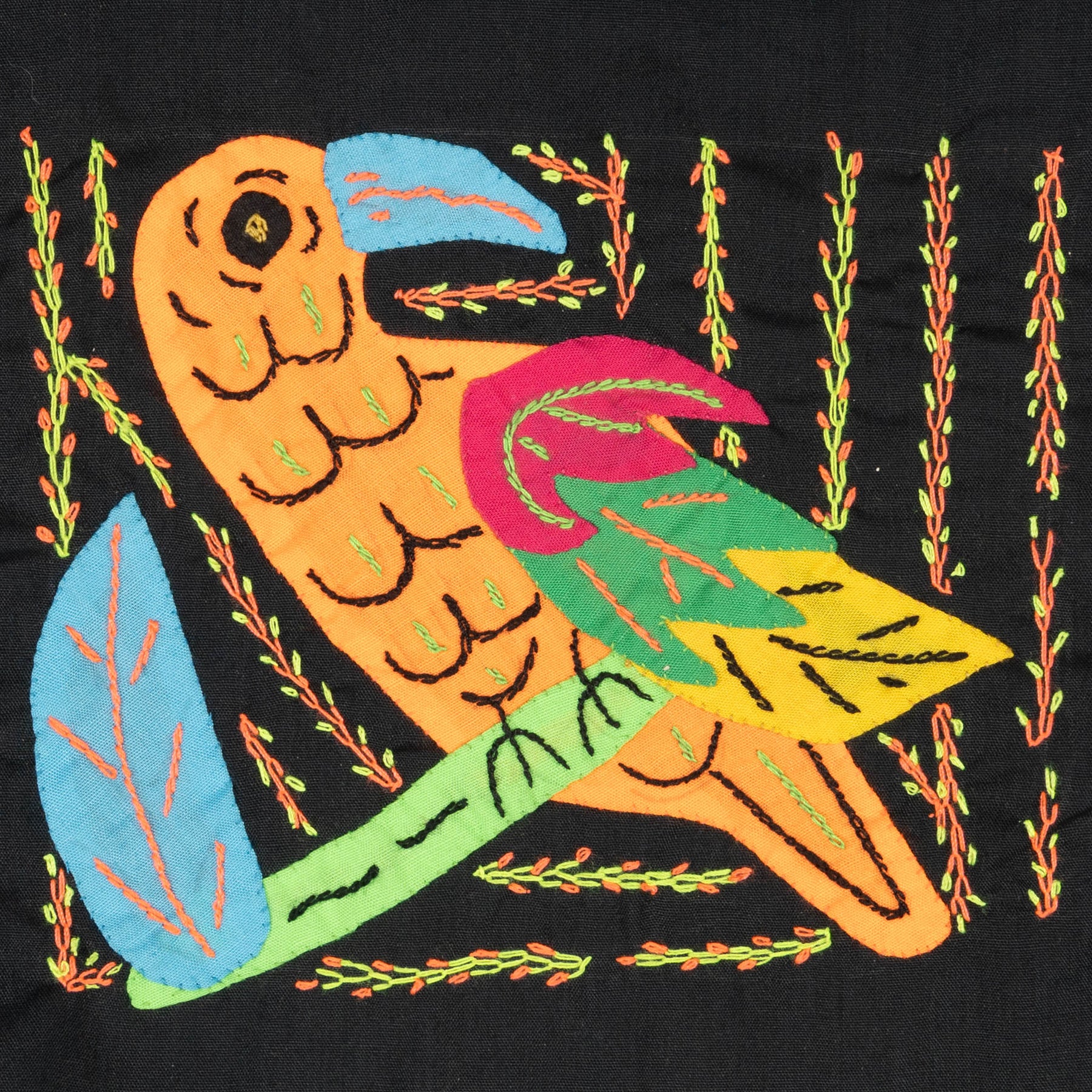 Hand sewn from layered cotton fabric, this colorful Multicolor Orange Red And Blue Bird Molita celebrates the traditional textile art of the Guna people of Panama. Each small panel is created using reverse appliqué, where artisans carefully cut and stitch several layers of cloth to reveal intricate patterns, animals, and geometric motifs. Every molita is made by our artisan partners for TraderBrock, supporting long term relationships with Guna communities in the Guna Yala region.