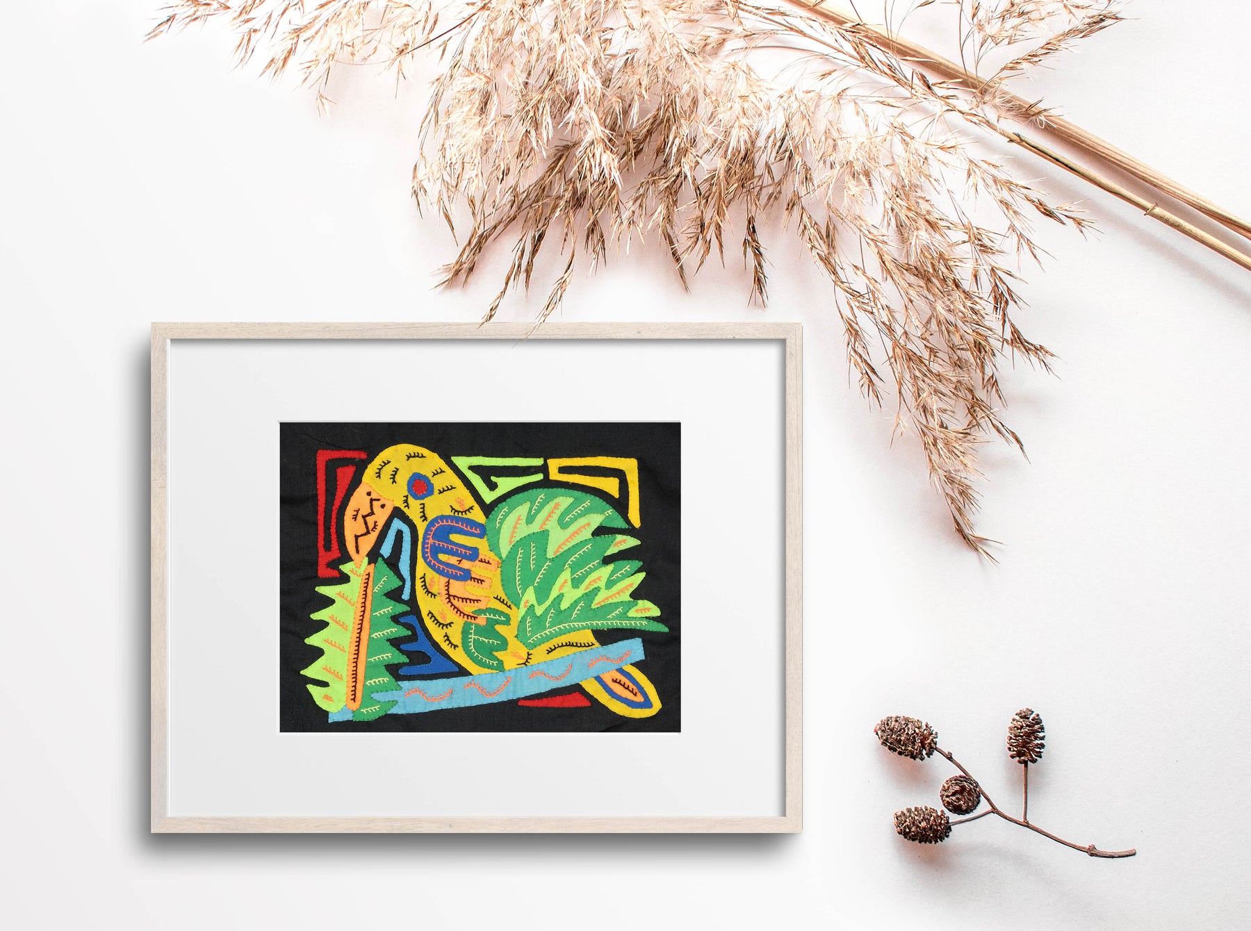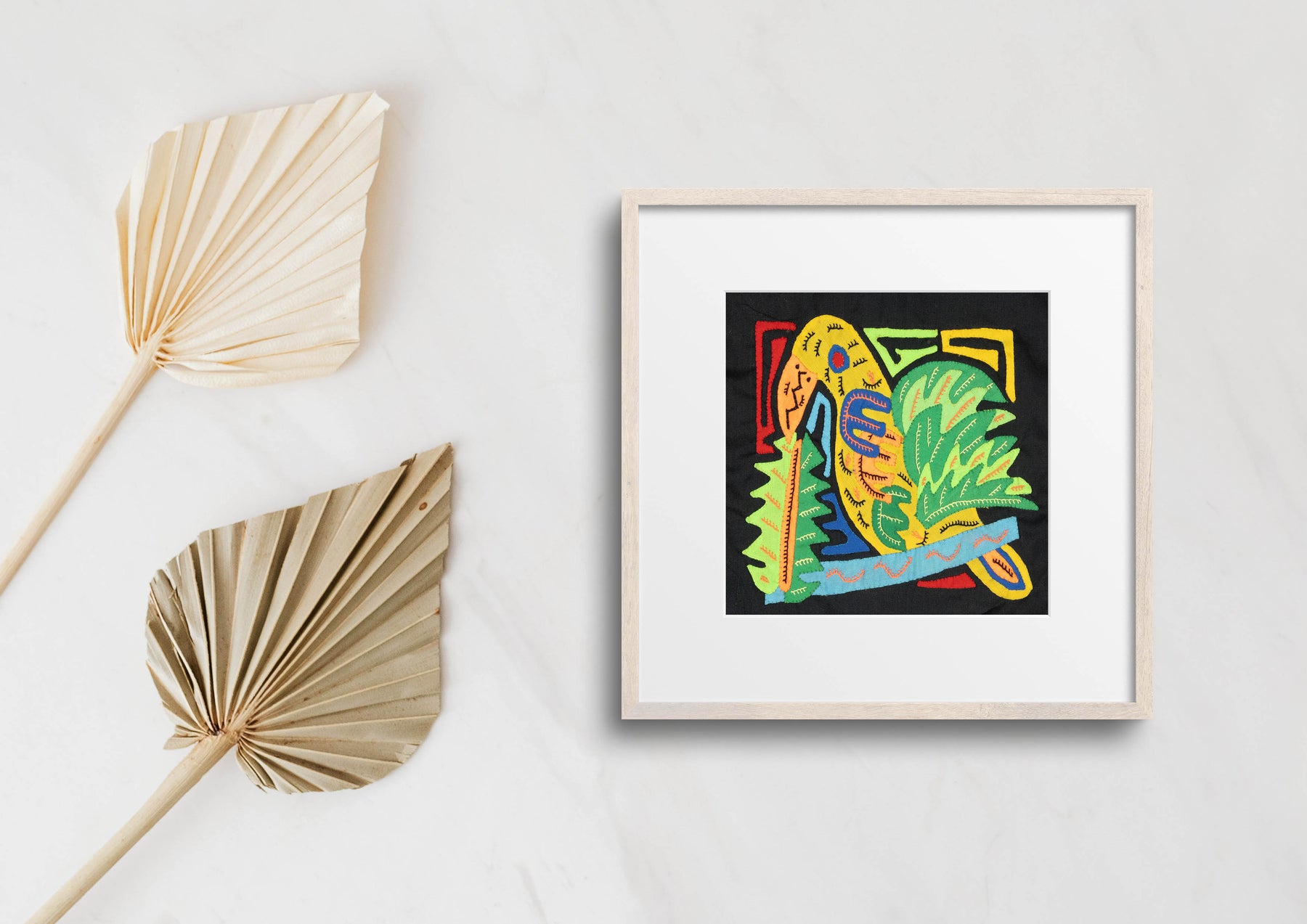 Hand sewn from layered cotton fabric, this colorful Multicolor Yellow Green And Orange Bird Molita celebrates the traditional textile art of the Guna people of Panama. Each small panel is created using reverse appliqué, where artisans carefully cut and stitch several layers of cloth to reveal intricate patterns, animals, and geometric motifs. Every molita is made by our artisan partners for TraderBrock, supporting long term relationships with Guna communities in the Guna Yala region.