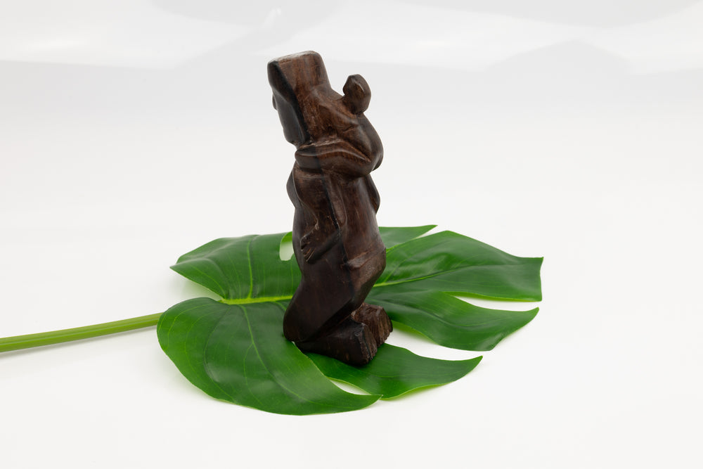 This vintage cocobolo wood carving has been in our inventory for 30 years or more. It depicts a woman on her knees. I like to think she is praying. Perhaps she has a great problem represented by the monkey or sloth on her back.