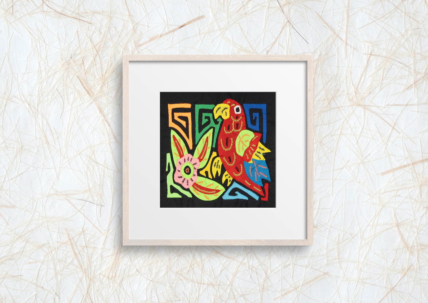 Hand sewn from layered cotton fabric, this colorful Multicolor Red And Green Bird Molita celebrates the traditional textile art of the Guna people of Panama. Each small panel is created using reverse appliqué, where artisans carefully cut and stitch several layers of cloth to reveal intricate patterns, animals, and geometric motifs. Every molita is made by our artisan partners for TraderBrock, supporting long term relationships with Guna communities in the Guna Yala region.