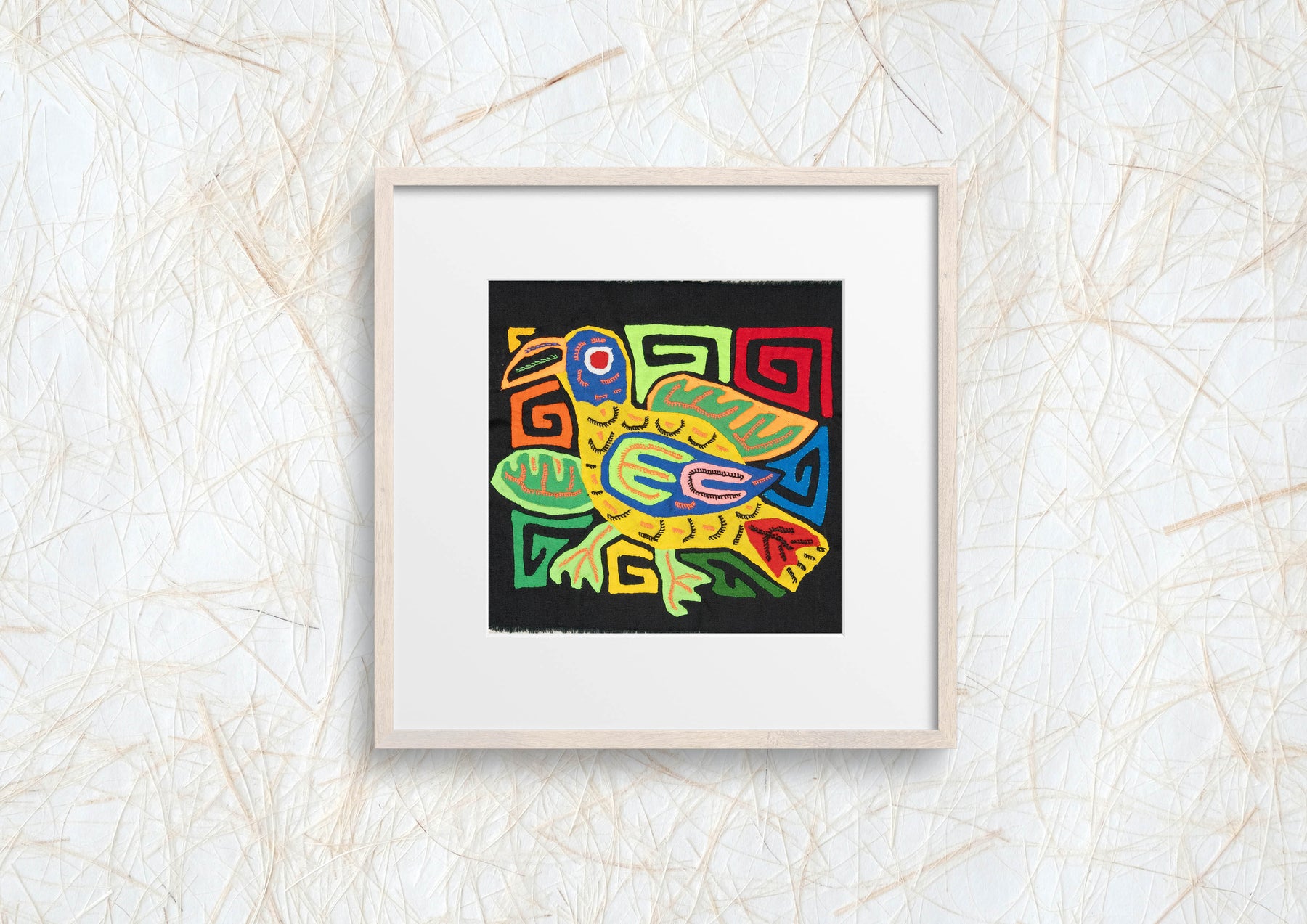 Hand sewn from layered cotton fabric, this colorful Multicolor Yellow Blue And Green Bird Molita celebrates the traditional textile art of the Guna people of Panama. Each small panel is created using reverse appliqué, where artisans carefully cut and stitch several layers of cloth to reveal intricate patterns, animals, and geometric motifs. Every molita is made by our artisan partners for TraderBrock, supporting long term relationships with Guna communities in the Guna Yala region.