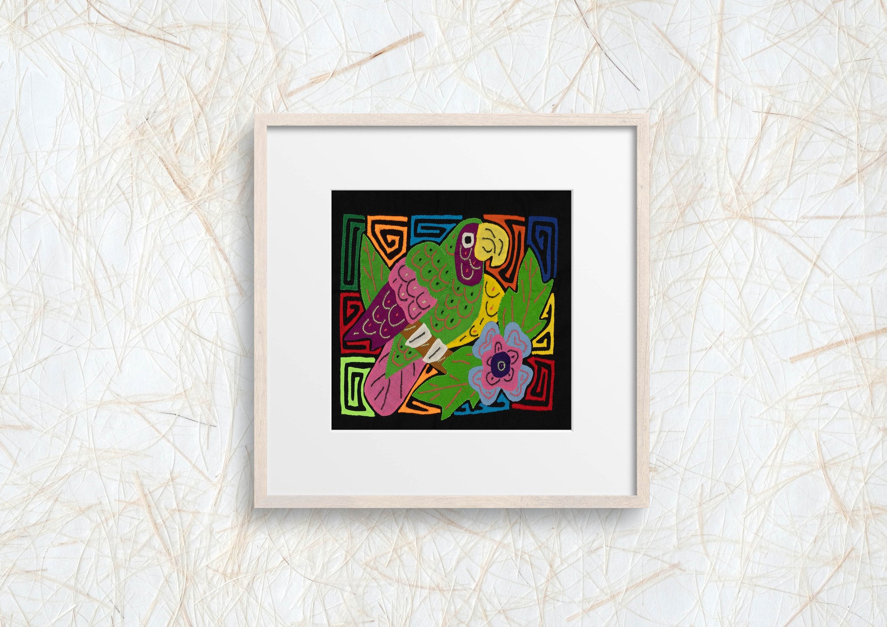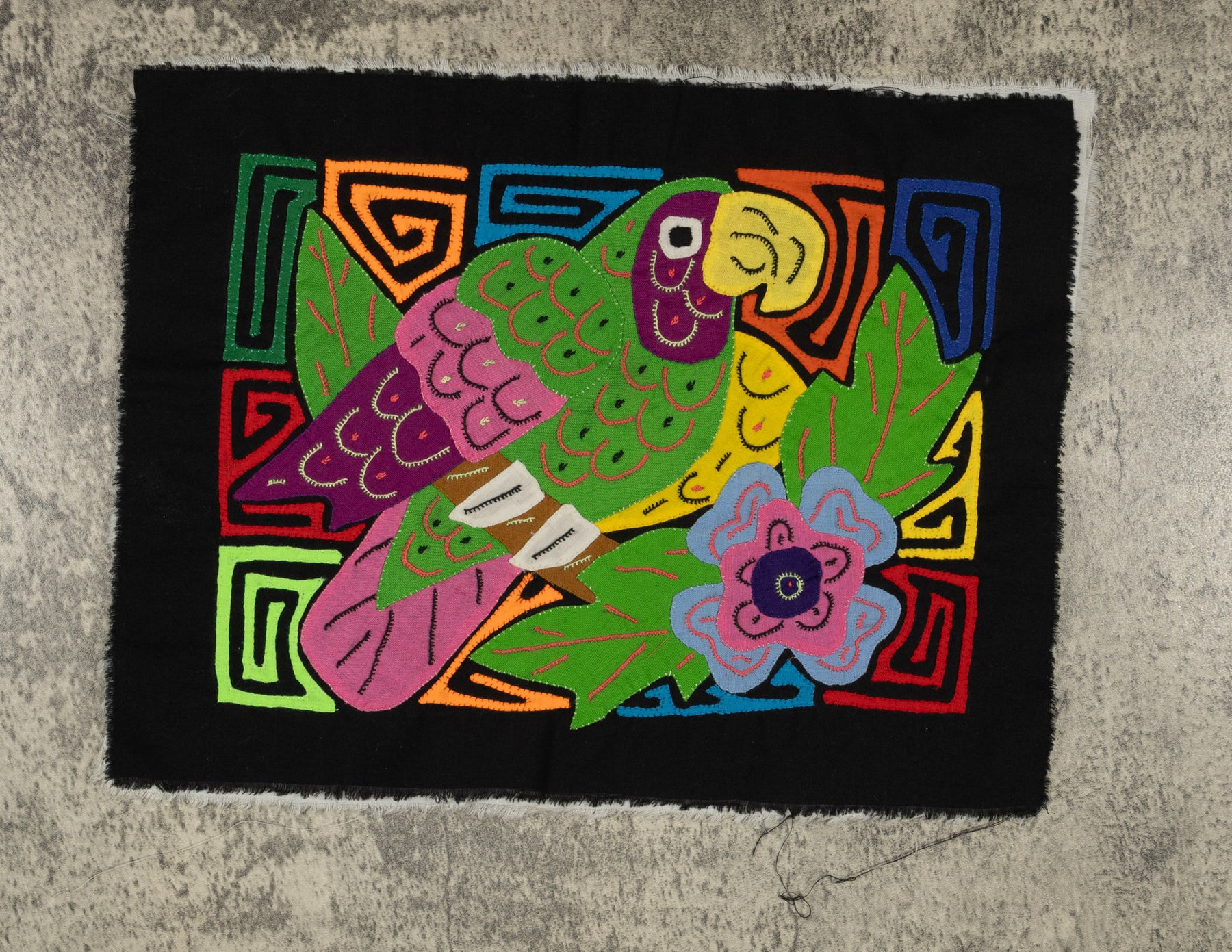 Hand sewn from layered cotton fabric, this colorful Multi-Color Green And Pink Parrot Bird Molita celebrates the traditional textile art of the Guna people of Panama. Each small panel is created using reverse appliqué, where artisans carefully cut and stitch several layers of cloth to reveal intricate patterns, animals, and geometric motifs. Every molita is made by our artisan partners for TraderBrock, supporting long term relationships with Guna communities in the Guna Yala region.