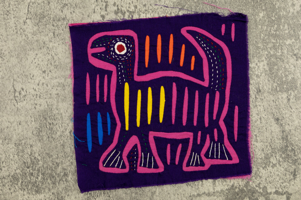 TRADITIONAL CONSTRUCTION & DESIGN: Molas are hand-made using a reverse appliqué technique using several layers of different colored cloth. The largest pattern is typically cut from the top layer and smaller patterns from each underlying layer. Geometric molas are the most traditional. Originating from ancient body paintings. Designs usually portray wildlife in the Rainforest. Inspiration comes from the nature and beauty that surrounds them.