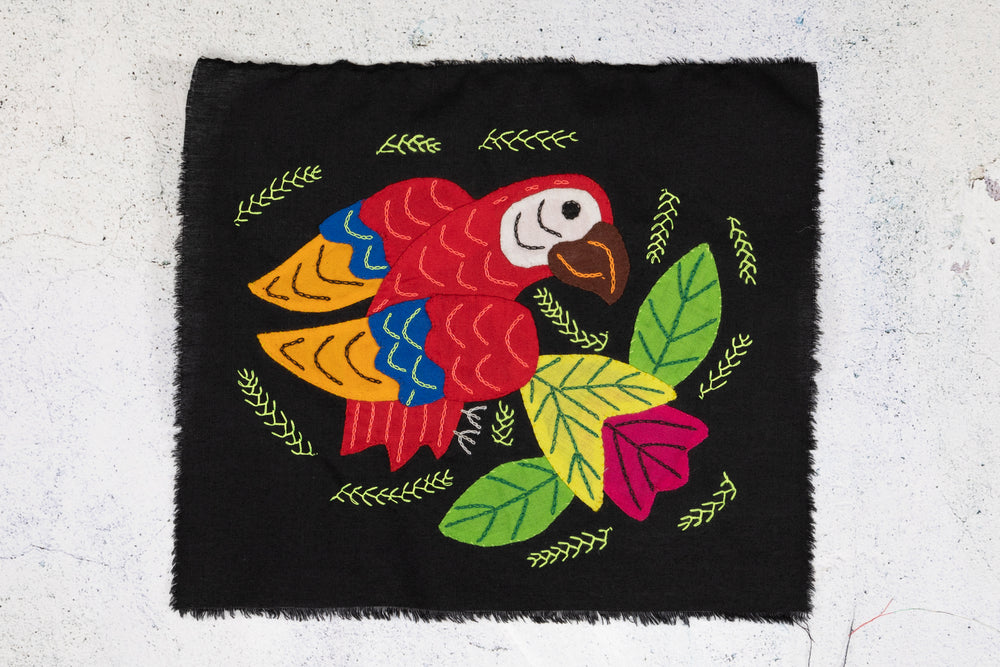 TRADITIONAL CONSTRUCTION & DESIGN: Molas are hand-made using a reverse appliqué technique using several layers of different colored cloth. The largest pattern is typically cut from the top layer and smaller patterns from each underlying layer. Geometric molas are the most traditional. Originating from ancient body paintings. Designs usually portray wildlife in the Rainforest. Inspiration comes from the nature and beauty that surrounds them.