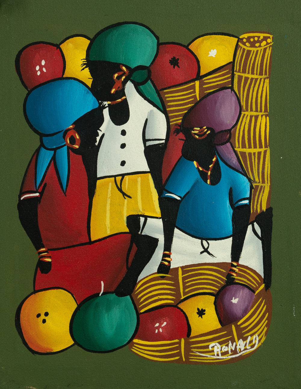 This painting features a trio of figures, their garments a kaleidoscope of primary colors that stand out boldly against the olive-green background. The characters, depicted with exaggerated features and carrying baskets of brightly colored fruits, are a testament to the strength and resilience of the Haitian people. The artwork’s playful use of shadow and light, along with the artist's signature in the corner, adds depth and authenticity to the scene.