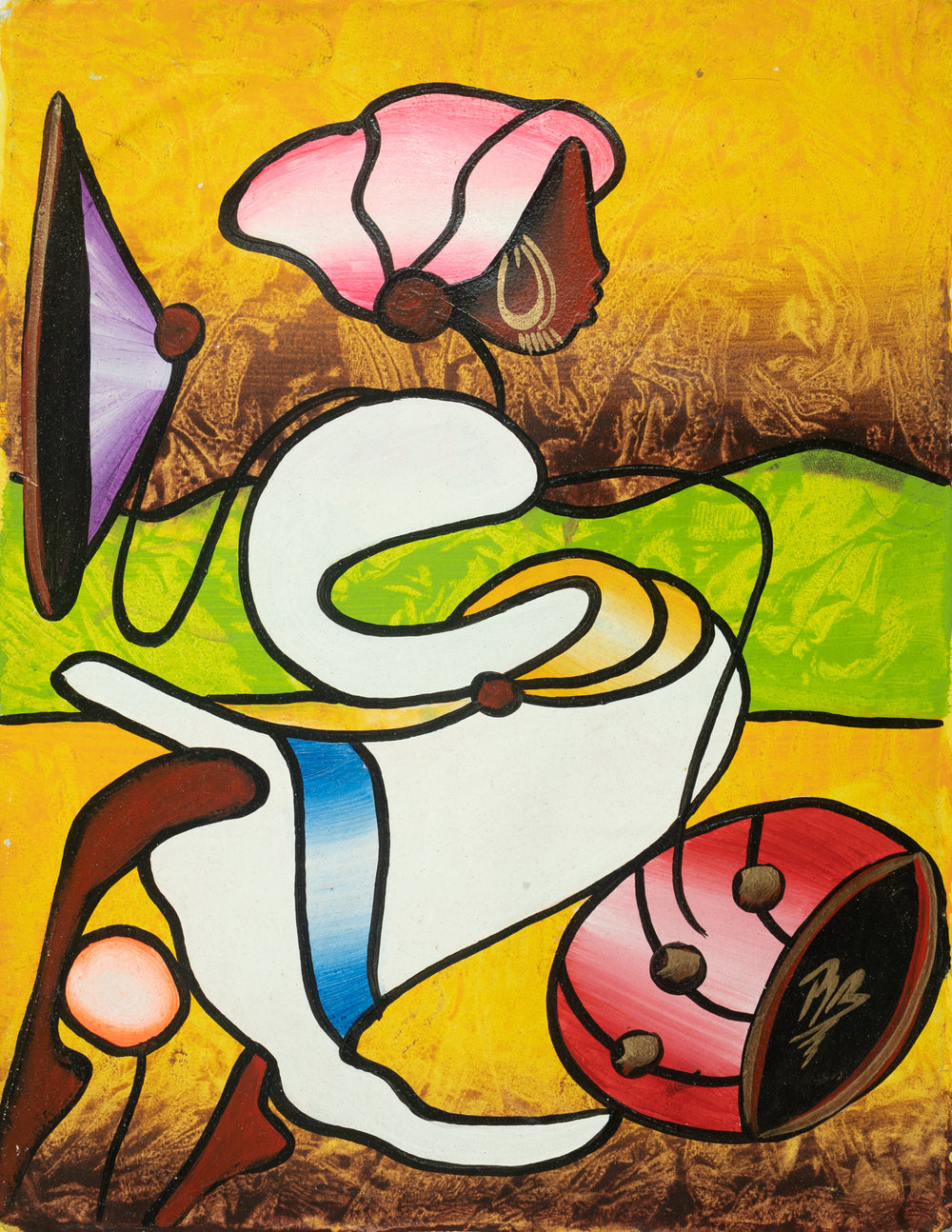 "Rhythmic Contours" is a striking piece of abstract art by renowned Haitian artist M. Zephirin. This painting captures the essence of music and movement, portraying an abstract figure engaged in the art of drumming, a cornerstone of Haitian cultural expression.