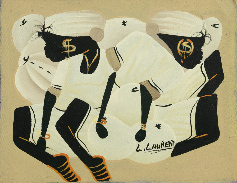 L. Laurent's signature at the bottom of the painting assures authenticity, adding value to this piece for collectors and enthusiasts of Haitian art. The deep blue border serves as a visual anchor, framing the scene and drawing attention to the central motifs of connectivity and tradition.