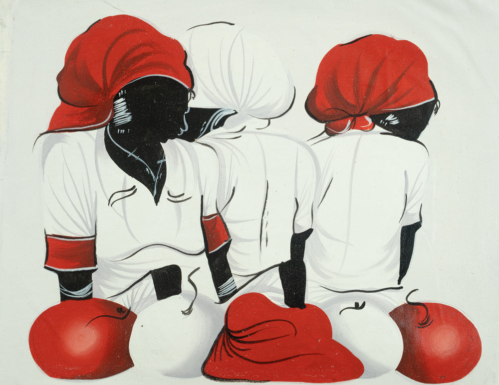 The composition centers on three women, their backs to the viewer, in deep conversation. Their vibrant red headscarves provide a striking contrast against the crisp white of their blouses, symbolizing both their individuality and their collective identity. The foreground features an array of fruit, mirroring the colorful essence of the marketplace.