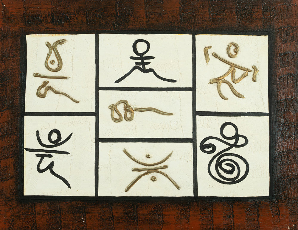 "Inscribed Ancestry" is a profound piece of Haitian art that encapsulates the island's rich narrative through abstract symbolism. This unique canvas painting, composed of nine individual panels, each bears a distinct symbol that collectively weaves the story of Haitian history, spirituality, and identity.
