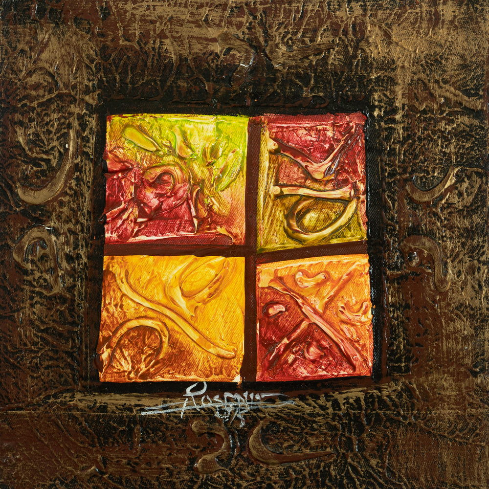 The artwork is segmented into a quartet of squares, each brimming with fiery reds, sunny yellows, earthy browns, and passionate oranges. These colors swirl together, each quadrant a separate canvas that contributes to a cohesive and captivating whole. The heavy texture of the paint adds a three-dimensional quality to the piece, with each stroke of color bursting forth from the canvas as if alive with emotion.