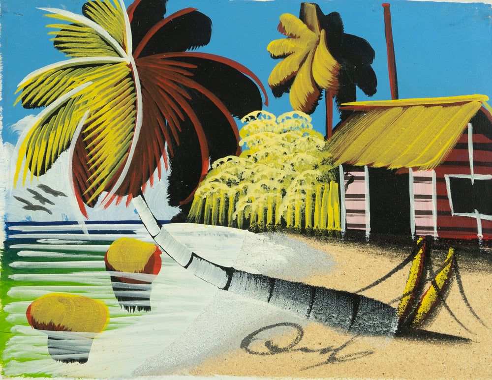 This piece is a window to the soul of the Haitian landscape, skillfully crafted by an artist who has captured the island's spirit in every brushstroke. The raw edges of the canvas and the artist's signature provide a sense of intimacy and connection to the creator's hand.