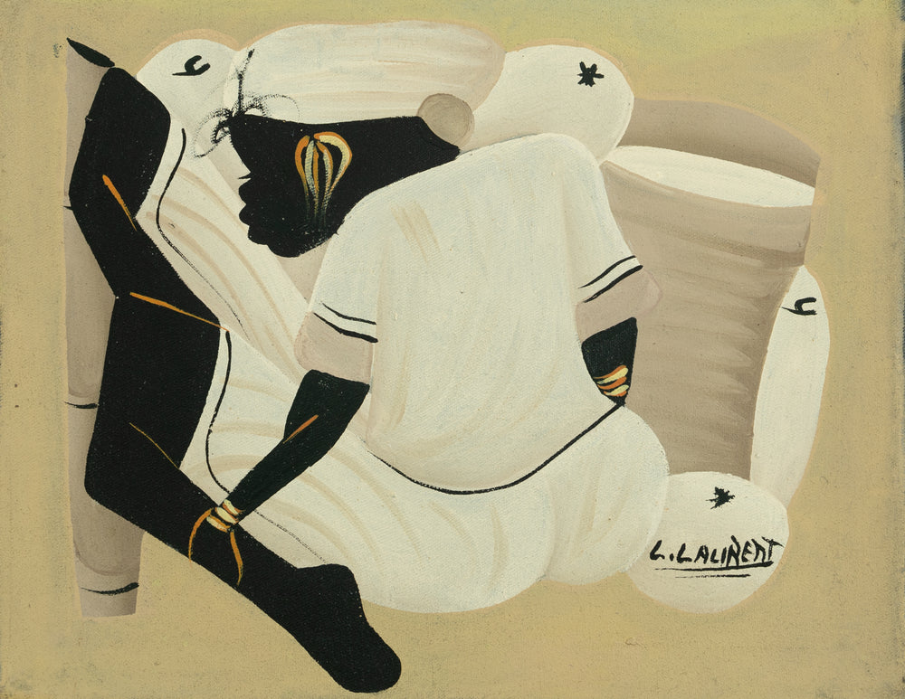 L. Laurent's signature is prominently featured, adding a layer of authenticity to this eloquent portrayal of Haitian life. The deep blue border serves to frame the artwork, giving it a finished look that is ready to complement any space.