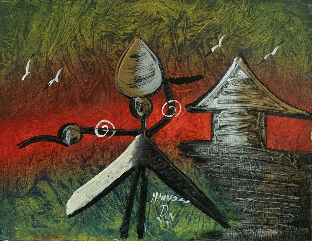 Description: "Rustic Echoes" is an evocative piece of contemporary Haitian art that captivates with its abstract depiction of rural life. This painting presents a minimalist landscape where simplicity speaks volumes, featuring a stylized figure and architectural form that merge the boundaries between the animate and inanimate. The composition is an exploration of texture and silhouette, with the figure's elongated limbs and the structure's rustic contours creating a harmonious yet intriguing tableau.