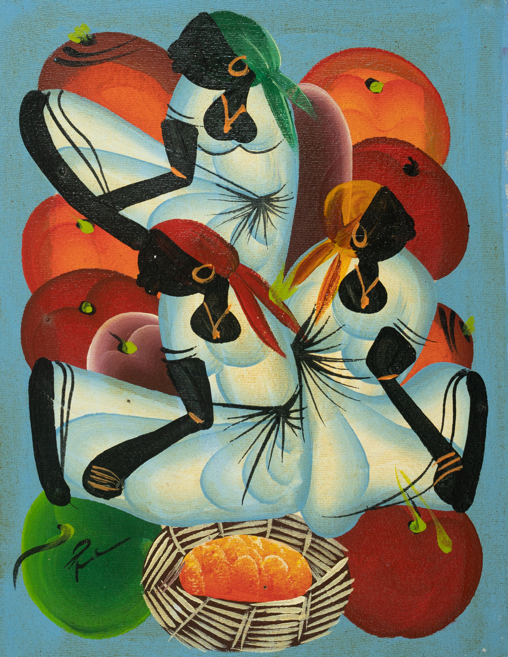 Set against a backdrop of oversized, luscious fruits, the dancers are portrayed with an almost lyrical grace, their forms a blend of realism and abstraction that is quintessentially Haitian. The artist's use of bold, contrasting colors highlights the dancers and the fruits, creating a visual harmony that is as delightful to the eye as a melody is to the ear.
