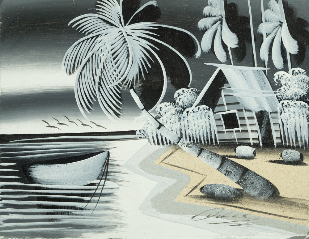 SEO Keywords: Haitian seascape painting, monochromatic beach artwork, original Haitian art, tranquil coastal scene, black and white palm trees painting, serene seaside canvas.