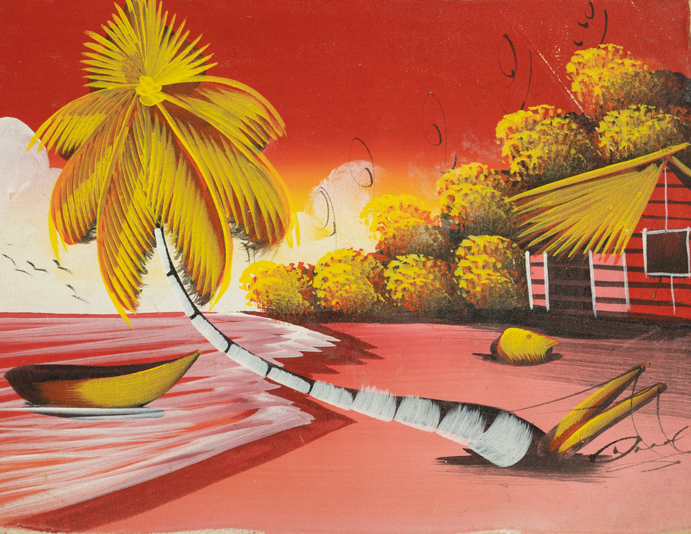 This artwork features a lone boat resting on the shore, framed by the silhouetted sway of palm trees, invoking a sense of peace and solitude. The rich, vibrant colors are a testament to the end of a day in Haiti, with promises of renewal and calmness as evening approaches.