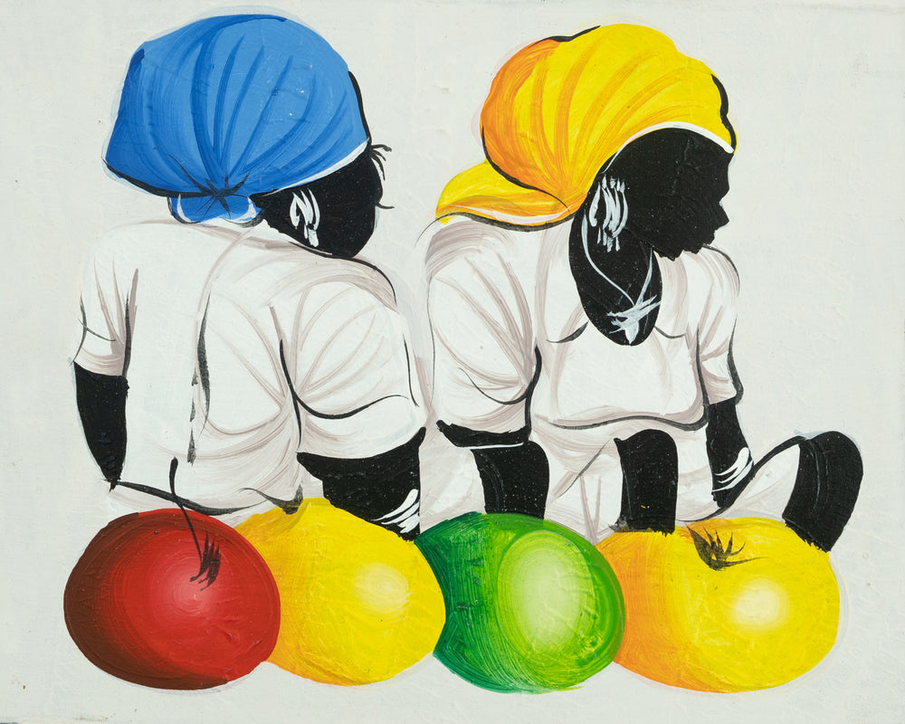 Engage with the serene side of market life in "Citrus Contemplation," a contemplative canvas painting that captures a quiet moment amidst the hustle of a Haitian marketplace. Painted by a distinguished local artist, this artwork reflects the thoughtful pauses that punctuate daily life.