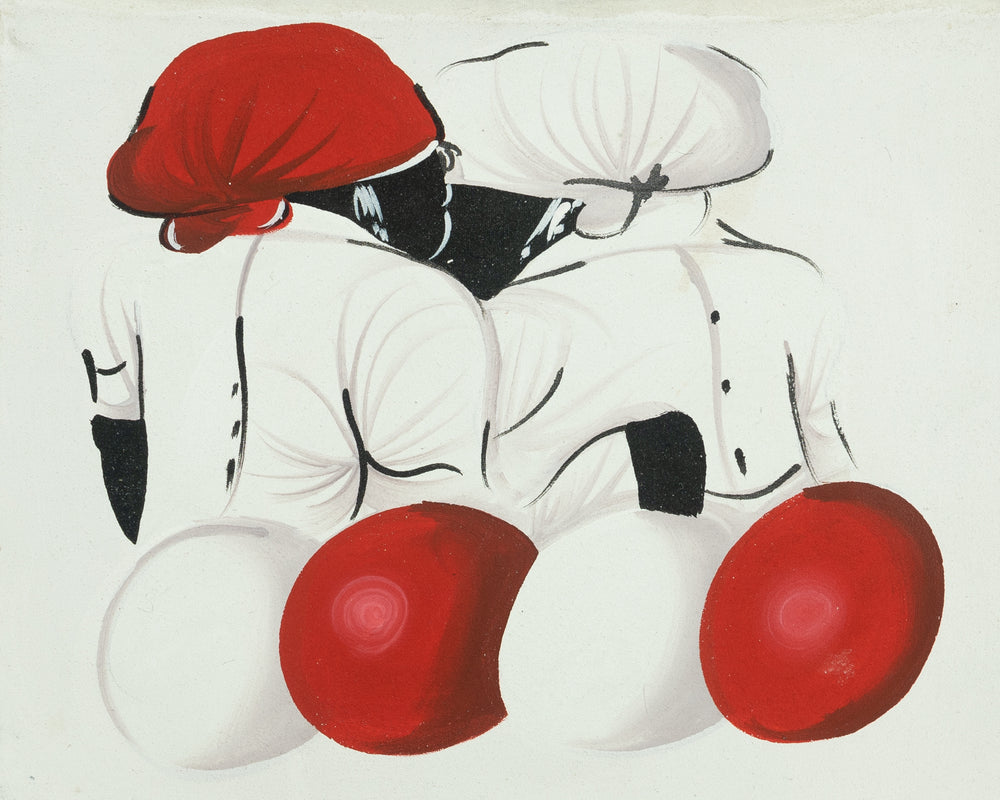 The painting's minimalist approach, with clean lines and a stark white background, allows the eye to focus on the fluidity of the forms and the dramatic use of red. This color choice is powerful, symbolizing passion, strength, and the vital spirit of the Haitian people. The red headscarf and rounded elements not only add a pop of color but also convey a sense of cultural identity and pride.