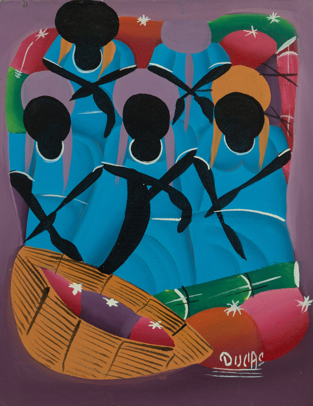 The artwork features silhouetted figures against a backdrop of cool blue, representing the ocean that is intrinsic to the livelihood of many Haitians. The characters are interlaced with a tapestry of bright, bold colors, symbolizing the diversity of goods and stories that flow through the market. The inclusion of the basket, brimming with produce, underscores the richness of the land and sea's bounty.