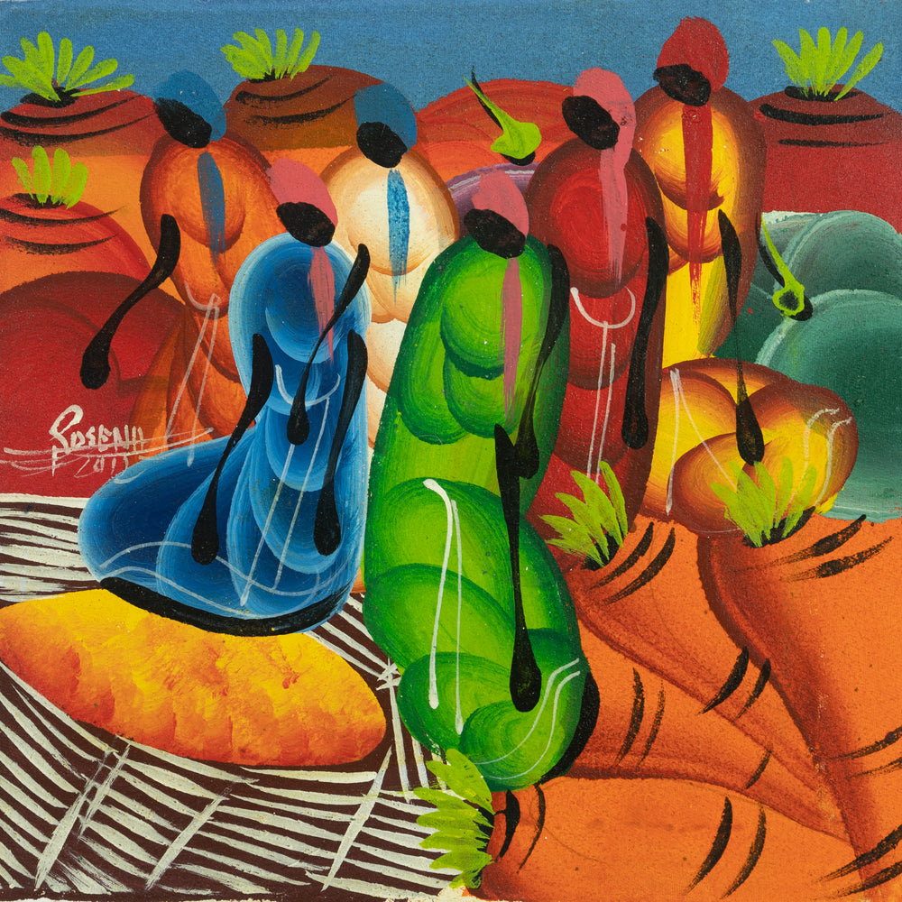 SEO Keywords: Haitian market scene painting, vibrant harvest canvas, local artist market depiction, colorful produce art, community marketplace artwork, acrylic vibrant market, cultural harvest scene, daily life in Haiti canvas