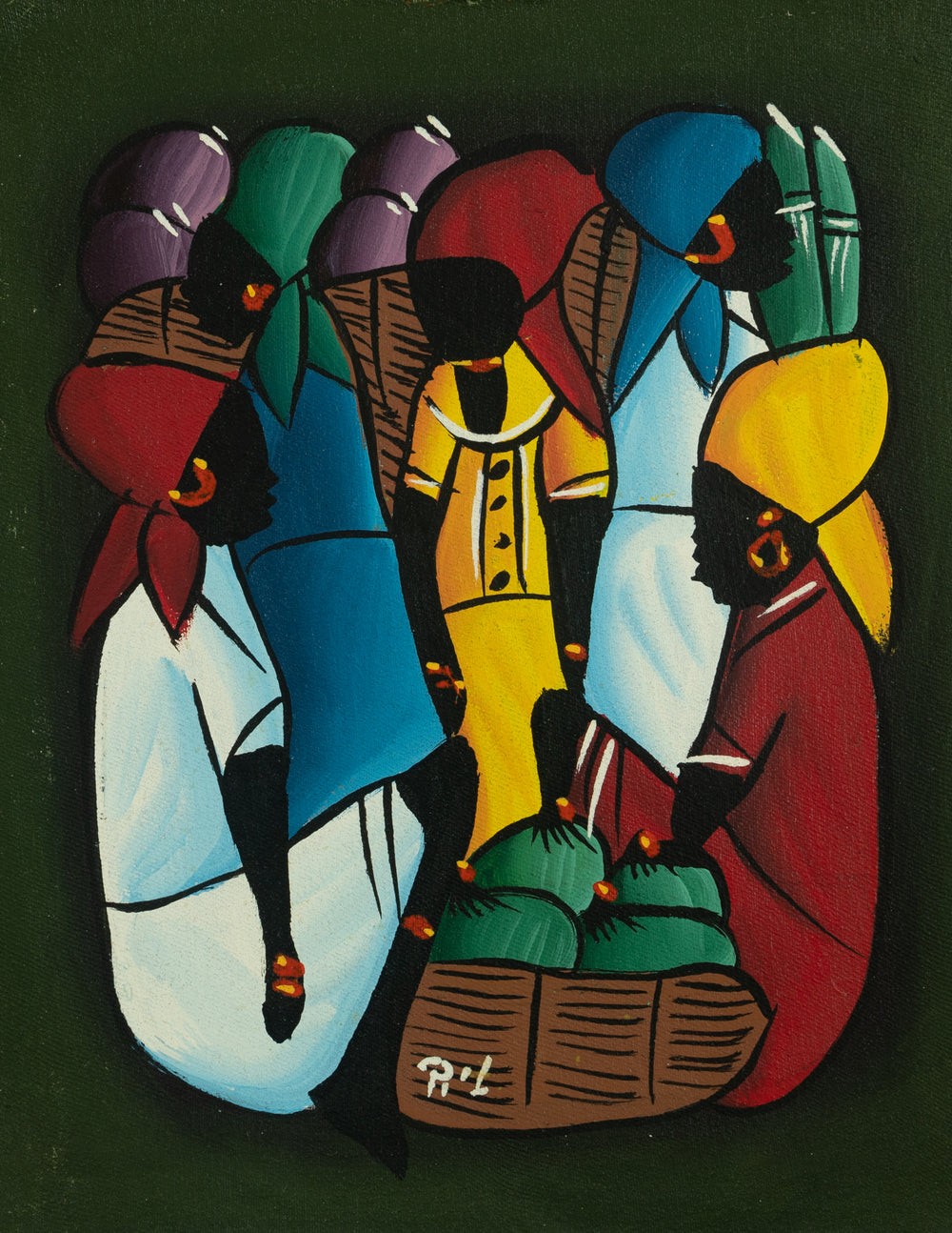 SEO Keywords: Haitian marketplace painting, daily life canvas, local artist vibrant scene, colorful market artwork, Haitian culture representation, acrylic painting of market, community life art, vibrant daily scene, market interaction depiction