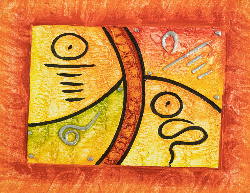 The canvas is alive with swirling patterns and bold lines that evoke the movement and heat of the sun. The fiery oranges and yellows are a testament to the intensity of the Caribbean climate, while the splashes of green hint at the lush landscapes nourished by the sun's embrace.