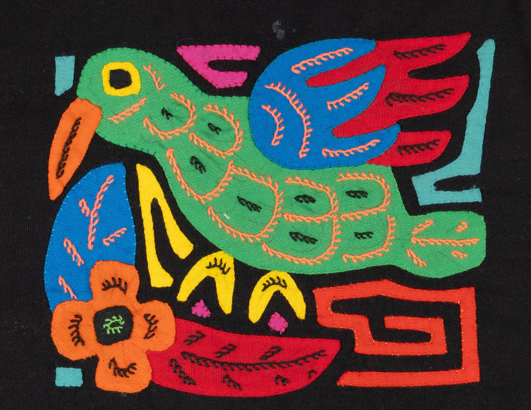 Molas often showcase animals such as birds, fish, turtles, and more. These designs can range from realistic to abstract and sometimes feature multiple animals in a single piece. Each depiction carries symbolic meaning and reflects the Guna people's deep connection to nature.
