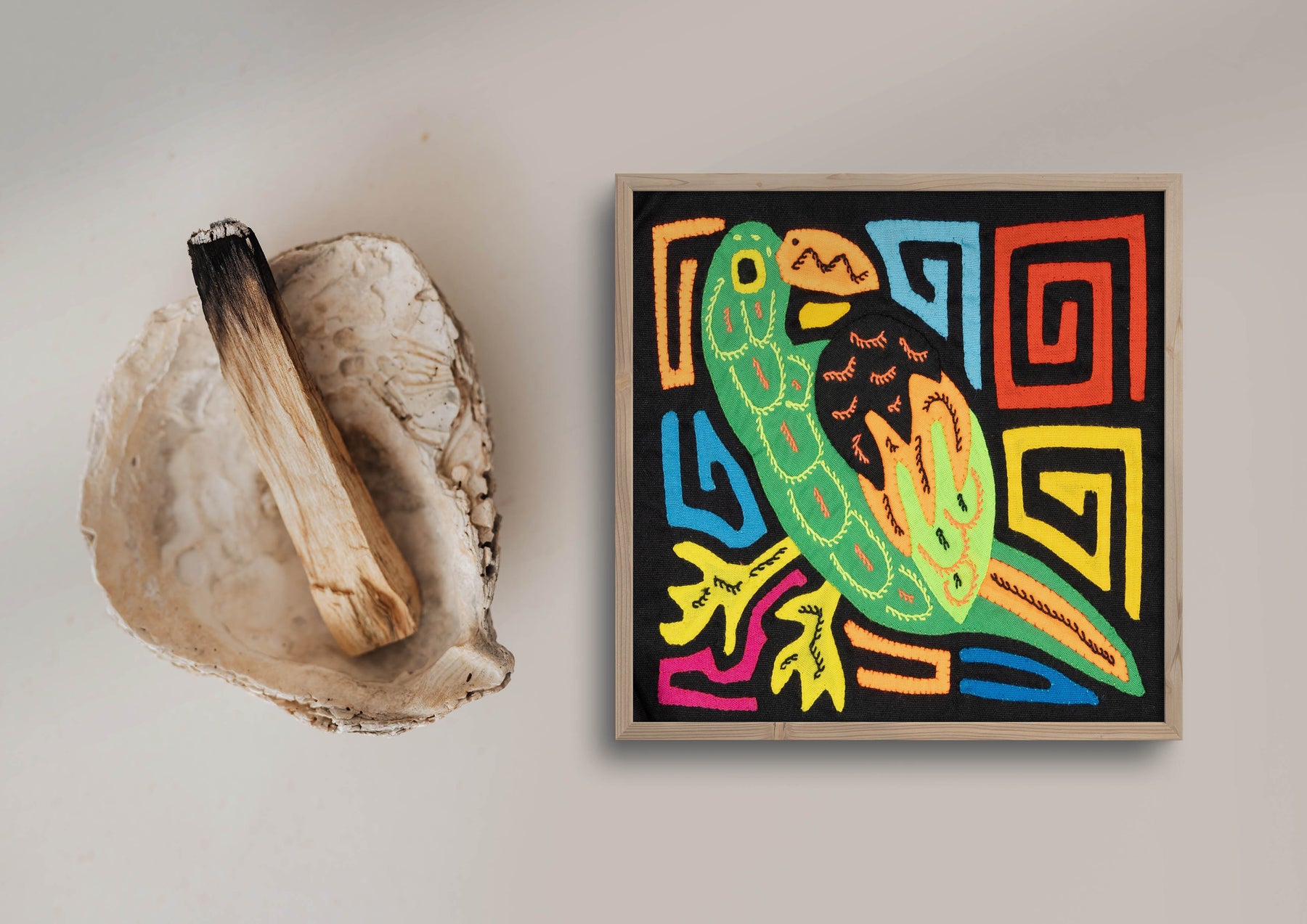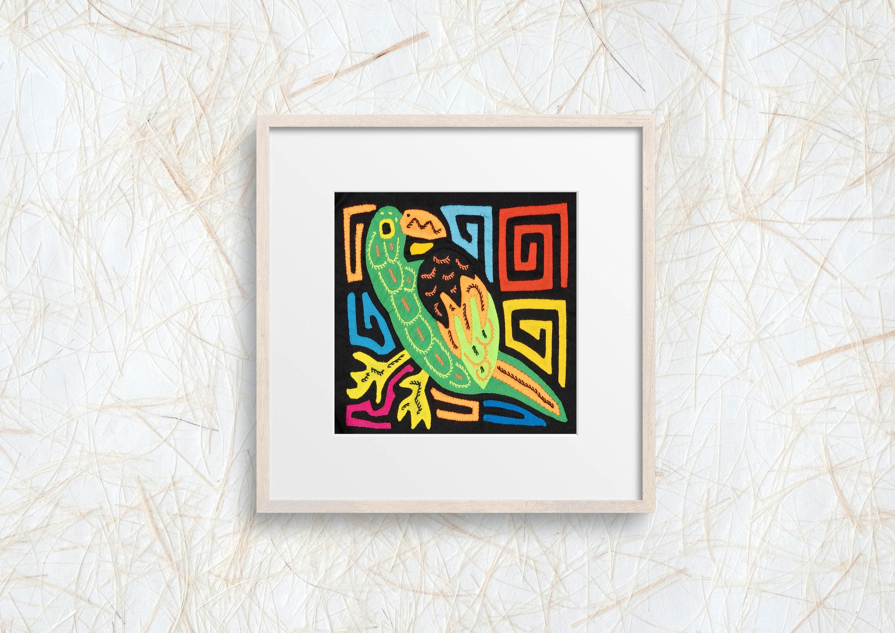 Hand sewn from layered cotton fabric, this colorful Green Parrot Bird Molita celebrates the traditional textile art of the Guna people of Panama. Each small panel is created using reverse appliqué, where artisans carefully cut and stitch several layers of cloth to reveal intricate patterns, animals, and geometric motifs. Every molita is made by our artisan partners for TraderBrock, supporting long term relationships with Guna communities in the Guna Yala region.