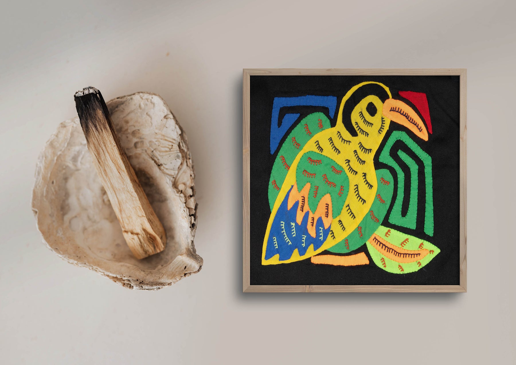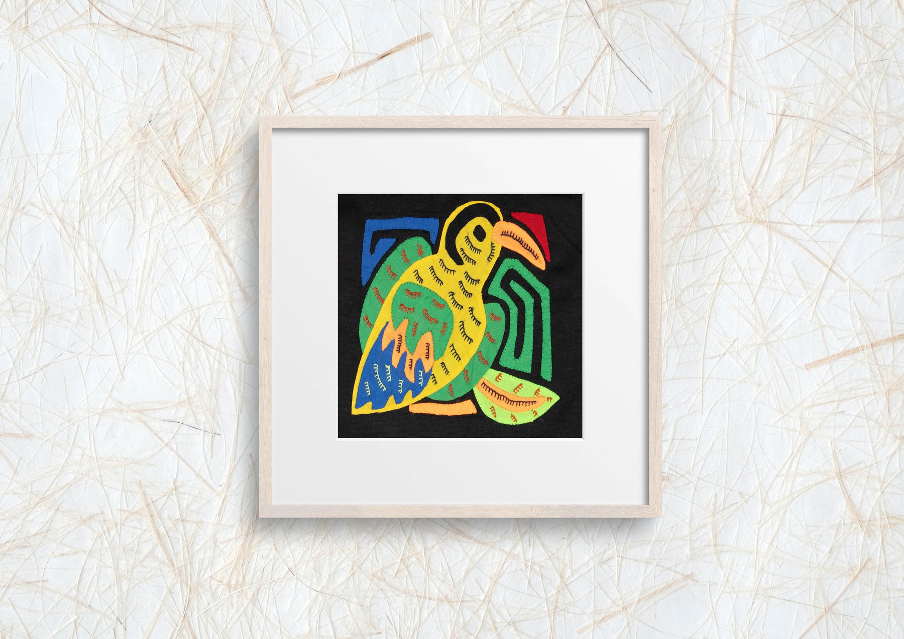 Hand sewn from layered cotton fabric, this colorful Multicolor Green Blue And Yellow Bird Molita celebrates the traditional textile art of the Guna people of Panama. Each small panel is created using reverse appliqué, where artisans carefully cut and stitch several layers of cloth to reveal intricate patterns, animals, and geometric motifs. Every molita is made by our artisan partners for TraderBrock, supporting long term relationships with Guna communities in the Guna Yala region.