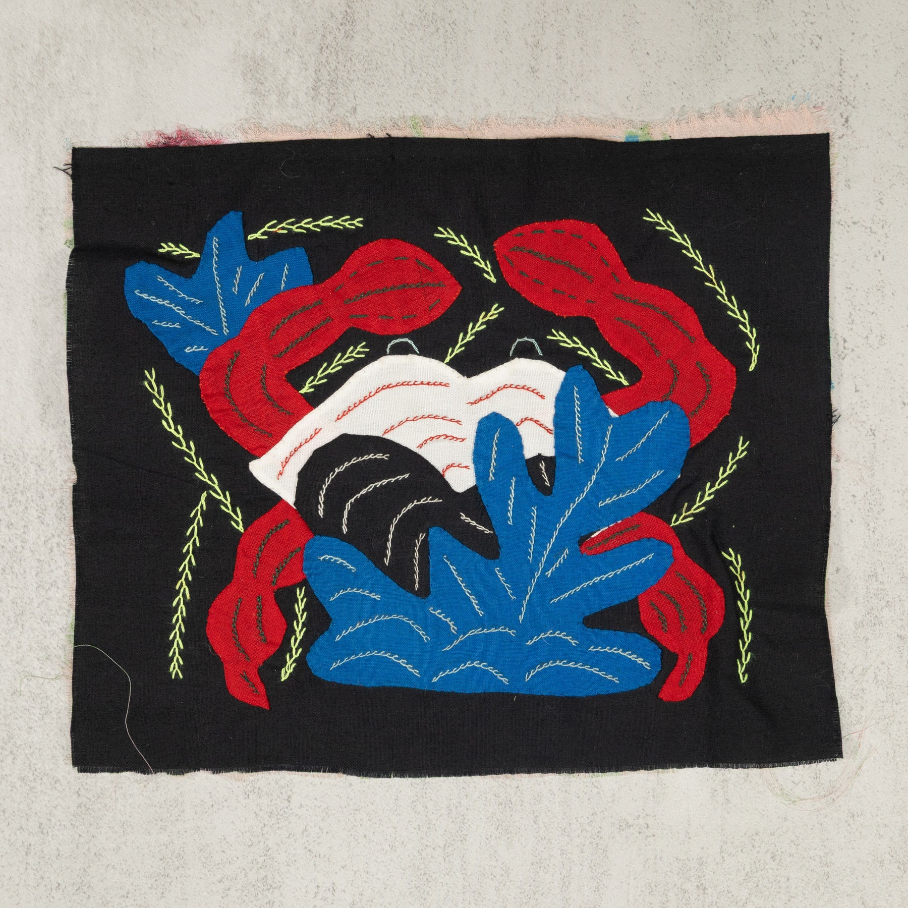 Hand sewn from layered cotton fabric, this colorful Red White And Blue Fantasy Crab Molita celebrates the traditional textile art of the Guna people of Panama. Each small panel is created using reverse appliqué, where artisans carefully cut and stitch several layers of cloth to reveal intricate patterns, animals, and geometric motifs. Every molita is made by our artisan partners for TraderBrock, supporting long term relationships with Guna communities in the Guna Yala region.