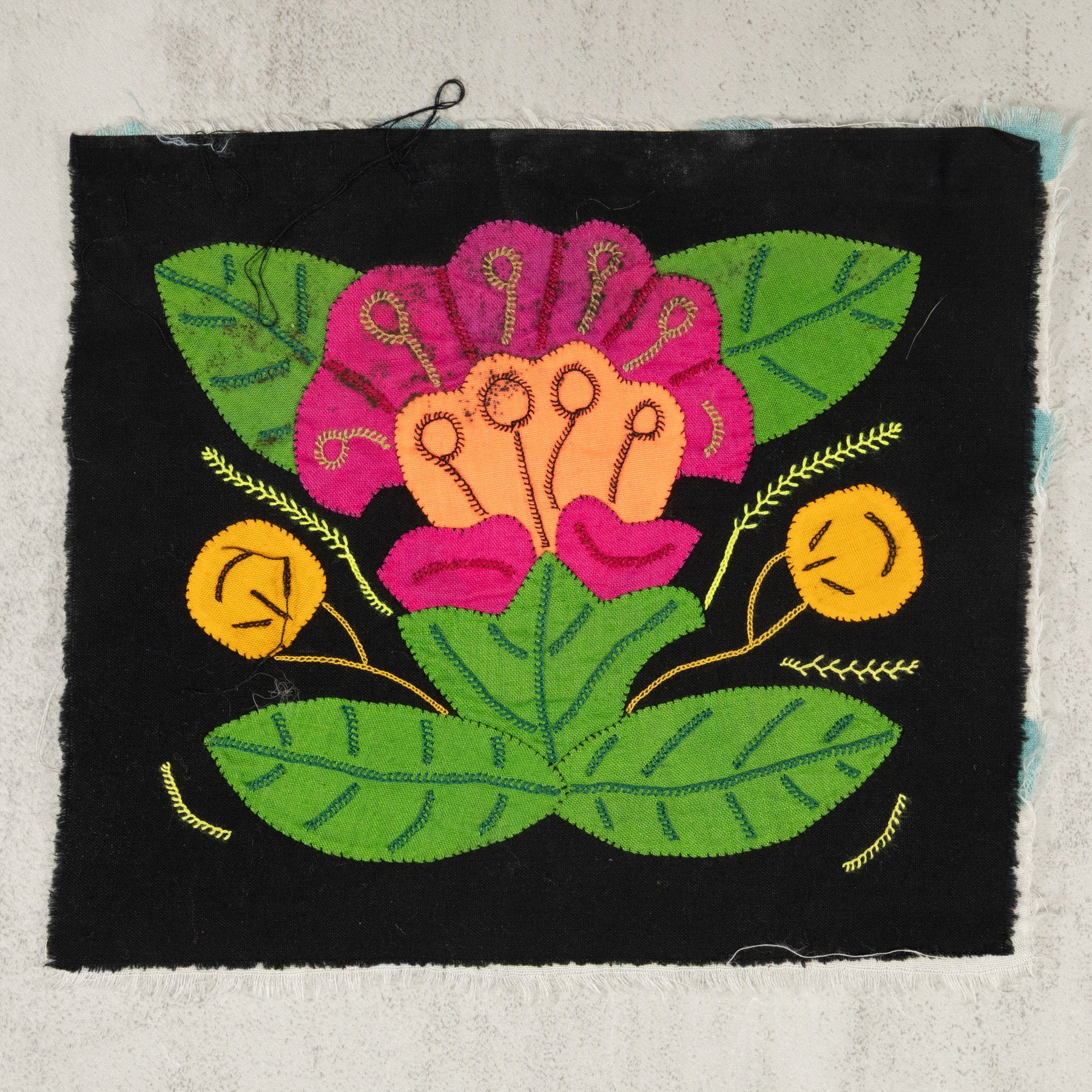 Floral molas highlight the beauty of nature through depictions of flowers, leaves, and vines. Whether stylized or realistic, these patterns often feature vivid colors and represent growth, life, and harmony with the natural world.