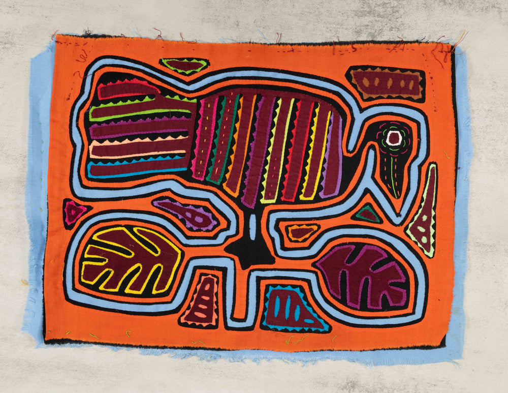 TRADITIONAL CONSTRUCTION & DESIGN: Molas are hand-made using a reverse appliqué technique using several layers of different colored cloth. The largest pattern is typically cut from the top layer and smaller patterns from each underlying layer. Geometric molas are the most traditional. Originating from ancient body paintings. Designs usually portray wildlife in the Rainforest. Inspiration comes from the nature and beauty that surrounds them.