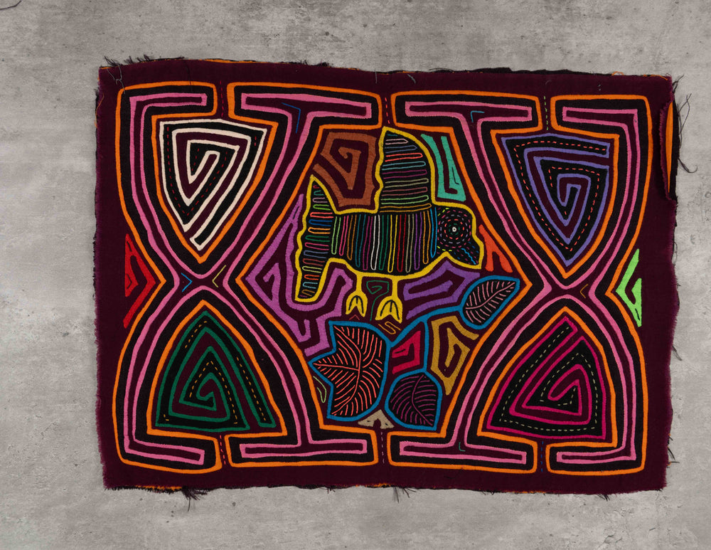 TRADITIONAL CONSTRUCTION & DESIGN: Molas are hand-made using a reverse appliqué technique using several layers of different colored cloth. The largest pattern is typically cut from the top layer and smaller patterns from each underlying layer. Geometric molas are the most traditional. Originating from ancient body paintings. Designs usually portray wildlife in the Rainforest. Inspiration comes from the nature and beauty that surrounds them.