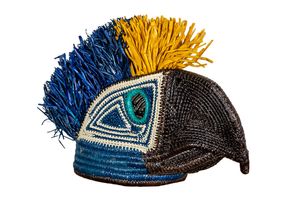 This intricately handwoven Blue and Yellow Macaw Mask is the perfect addition to any wall. The beautiful colors and patterns are eye-catching and will liven up any room. Not to mention, it's a great conversation starter! The mask is also Fair Trade, so you can feel good about your purchase knowing that you are directly contributing to the Indigenous artisan community of Panama.
