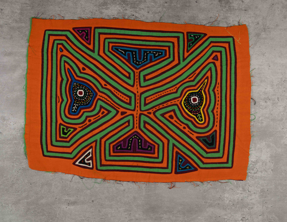 TRADITIONAL CONSTRUCTION & DESIGN: Molas are hand-made using a reverse appliqué technique using several layers of different colored cloth. The largest pattern is typically cut from the top layer and smaller patterns from each underlying layer. Geometric molas are the most traditional. Originating from ancient body paintings. Designs usually portray wildlife in the Rainforest. Inspiration comes from the nature and beauty that surrounds them.