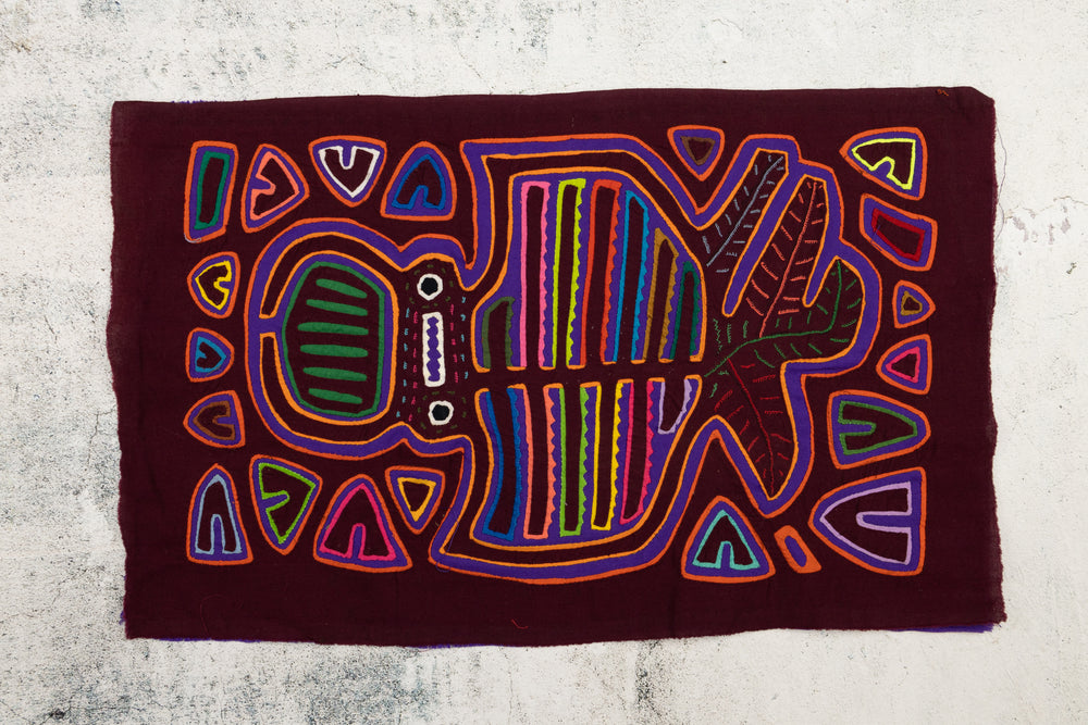 TRADITIONAL CONSTRUCTION & DESIGN: Molas are hand-made using a reverse appliqué technique using several layers of different colored cloth. The largest pattern is typically cut from the top layer and smaller patterns from each underlying layer. Geometric molas are the most traditional. Originating from ancient body paintings. Designs usually portray wildlife in the Rainforest. Inspiration comes from the nature and beauty that surrounds them.